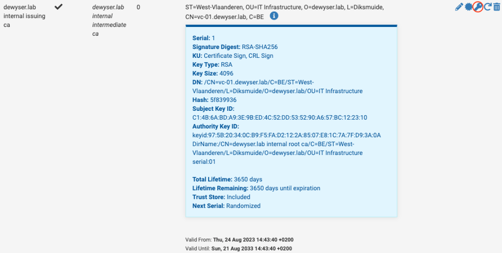 If we go back to our pfSense console administrator and head to System > Certificate Manager under CAs we find our certificate for the issuing authority.