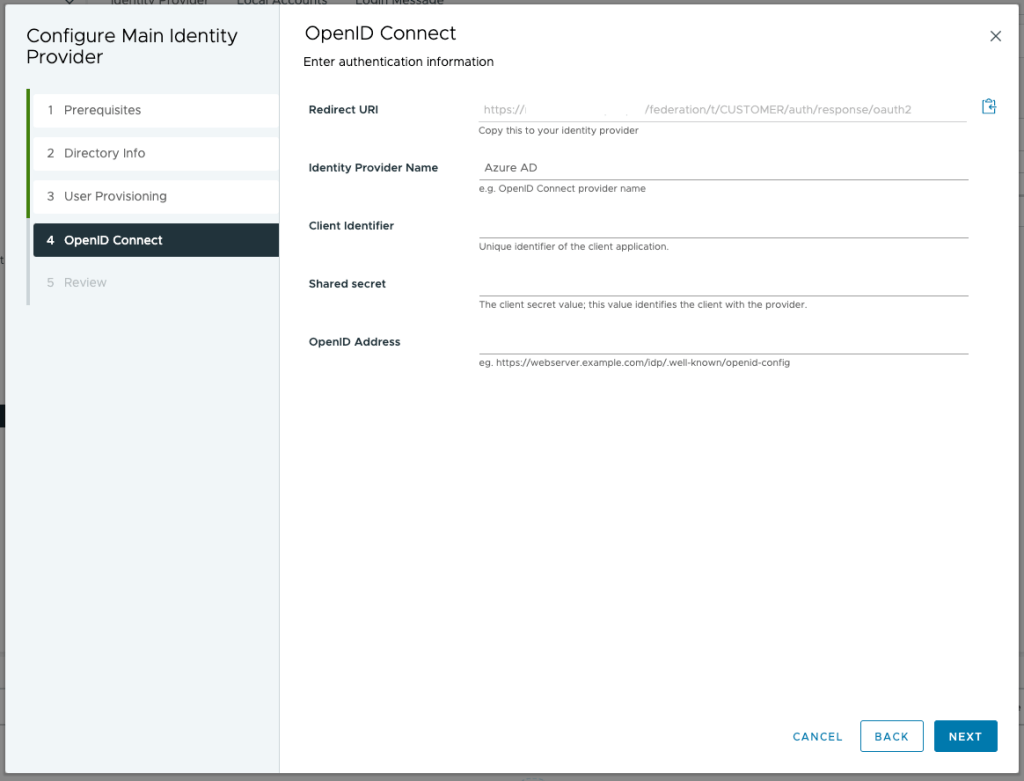 Fill in the saved values (App ID, secret value and OpenID link). Before continuing copy the Redirect URI.