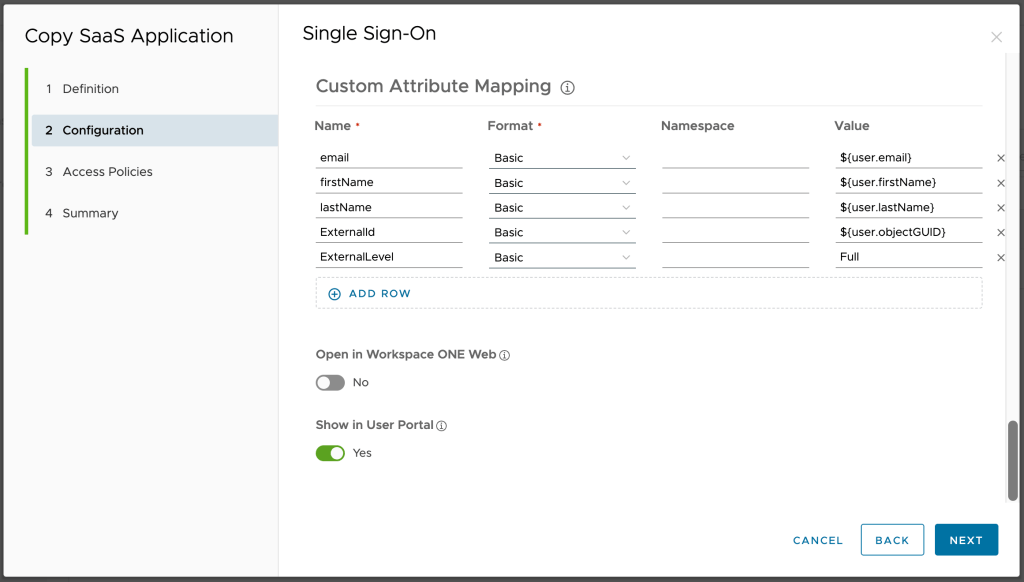 Now that we are done on our side, the customer side is next. First step is to create a custom attribute that we used in our tenant to hold the static text. Goto settings > user attributes, add a row to the custom attributes and name it ExternalLevel.